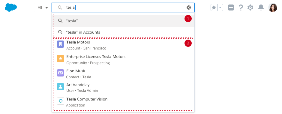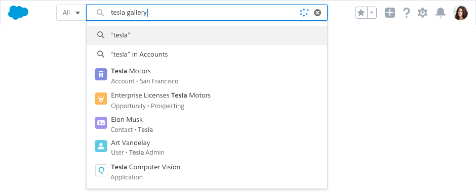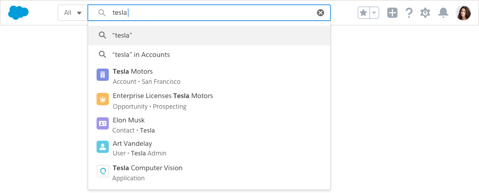 When your users execute a search, we query objects based on personalized usage and intelligent prediction. Those results are returned on a "Top Results" page that groups results together, making it easy to scan relevant results of different record types.