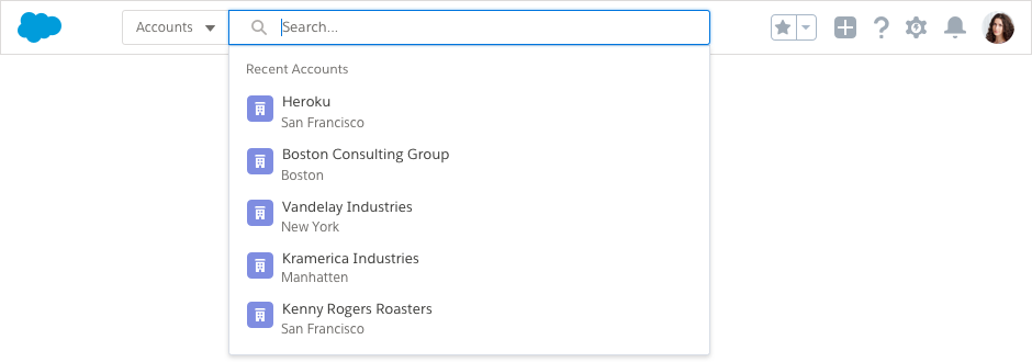 Each item shows the object icon, the record name, such as "Vandelay Industries", and the object name, such as "Account".